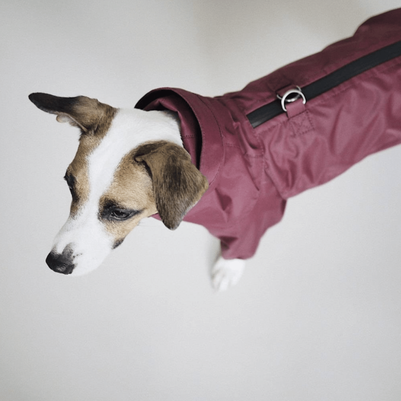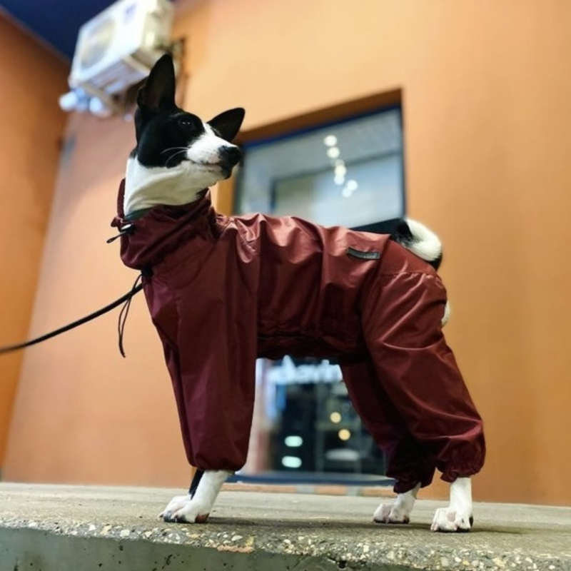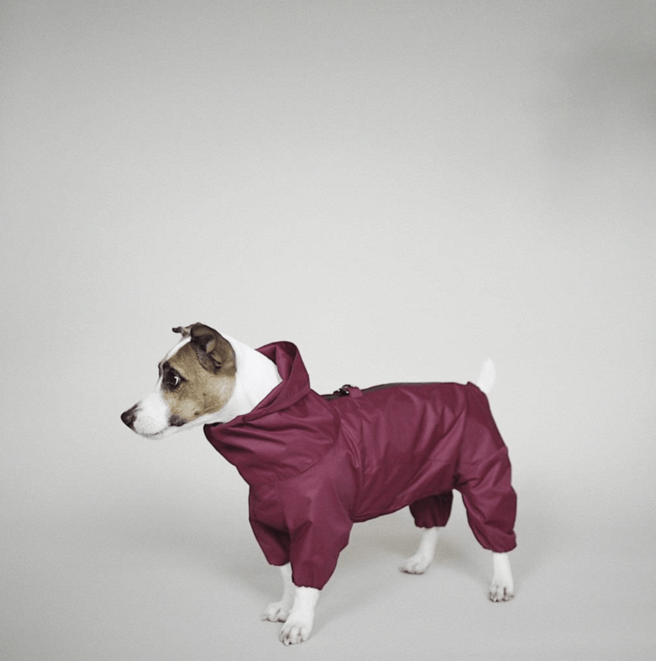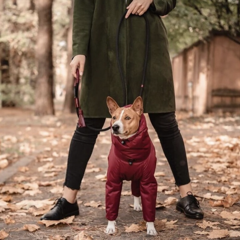Комбинезон легко надевается и застегивается в одно движение на прорезиненную молнию, чтобы не промокать во время прогулок, а под молнией прячется планка, чтобы не зацепить шерстку.