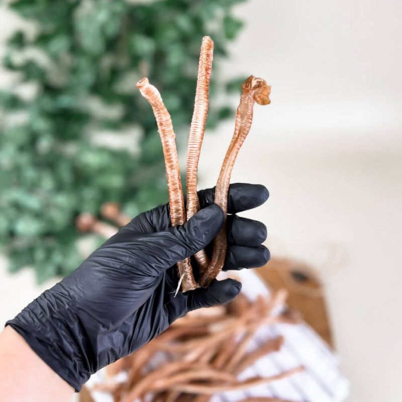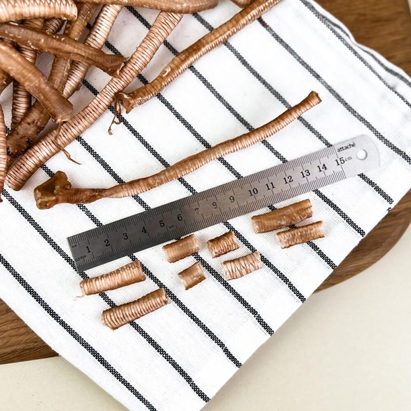Трахеи можно использовать для дрессировки всех пород: не крошатся, не пачкают руки и карманы, можно легко наломать на кусочки от 1 см. Главный плюс трахеи – она очень объемная, в 80г много трубочек (вес одной трубочки примерно 2-3 грамма) Питомца можно много угощать, но он при этом мало съест по ккал – идеальный вариант для собак с лишним весом или реакцией на большое количество белка.